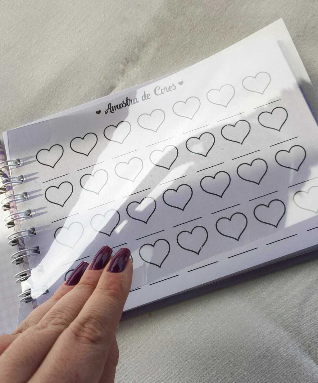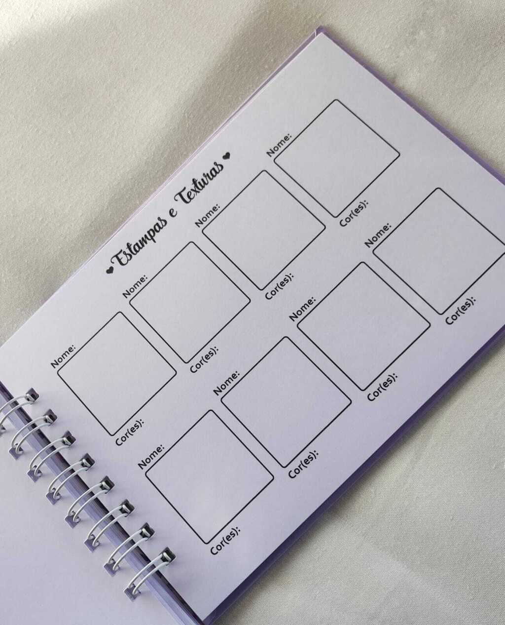 Caderno com gabaritos para você ter amostra da cores das suas canetinhas e lápis de cor! O caderno também conta com espaço para registro de estampas e texturas!